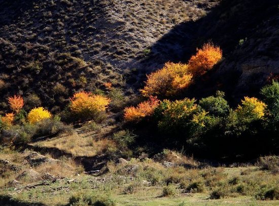 深秋时节,霍城县大西沟福寿山景色醉人。秋天把整个福寿山装扮成红、绿相间的世界,满山遍野都是色彩斑斓的花草树木,红的妖艳、黄的明丽,绿的和谐,五彩缤纷,满山遍野,千叶万树,色彩纷呈。各色成熟果实点缀其间,浑然一幅大自然天然画卷。登上福寿山,领略秋天的景色,心中油然而生“会当临绝顶,一览众山小”,更有心旷神怡,宠辱偕忘、把酒临风,其喜洋洋者矣之感。如是遇到阴雨天,半山腰云雾飘绕,苍鹰盘旋,更增加了福寿山的神秘感。每年秋季,这里都会吸引很多摄影爱好者前来采风,记录下这大自然鬼斧神工、天造地设的美景。