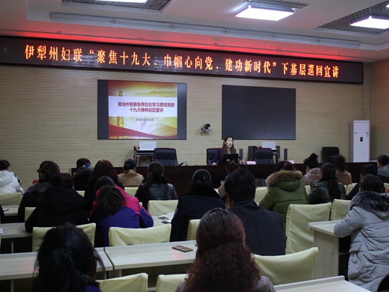 特克斯县妇联以自治区妇联举办的两期“巾帼心向党 建功新时代”党的十九大精神巾帼宣讲员骨干培训班为契机,本着高度负责的态度,经过认真推荐筛选,精选出2位政治上过硬、能起宣讲示范引领作用的优秀宣讲员参加了培训。两名宣讲员参加培训后,都深入基层,积极参与冬季大宣讲。她们用通俗易懂的语言将学到的宣讲内容传到基层群众中,让十九大精神家喻户晓。截止目前,共开展各类宣讲活动20余场次,覆盖面达95%。