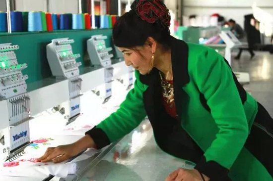 来自尼勒克县科蒙乡的哈萨克族妇女沙尼娅·卡特拜是多头电脑刺绣机的操作工。她说:“这里实行计件工资,干得越多,挣的越多。我一定要好好学习技术,早日成为一名熟练工。”