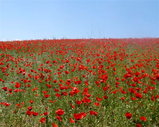 一片又一片气势磅礴的火烧云,就是早已声名远扬的天山红花,当地人称“大炮花”。天山红花在哈萨克语里被称为克孜卡勒达克,意思是美和自由的化身,又被称为野罂粟。每年四五月间,天山红花次第开放,山头、山脚、路旁、草原、田埂,随处可以寻到它的踪迹。今年春天,雨水充沛,气温相对较高,仿佛就在一夜间,山上的天山红花已经慢慢睁开了双眼,迫不及待地加入“天山之春”的序列,点缀着美丽的伊犁“花千谷”。