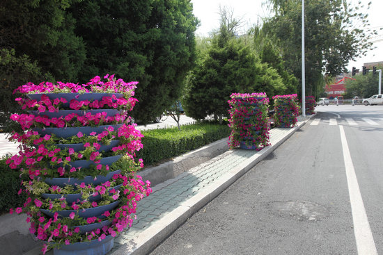 三是突出重点,打造精品。在双辰酒店十字路口、伊犁宾馆门前、八中三角花坛等重要节点摆放五色草模纹图案,布置时花立体绢花造型,以惟妙惟肖的立体造型营造"缤纷花城"城市风貌,促进城市环境从"绿化"到"美化"再到"艺术化"的发展。