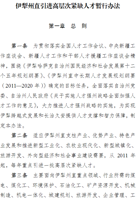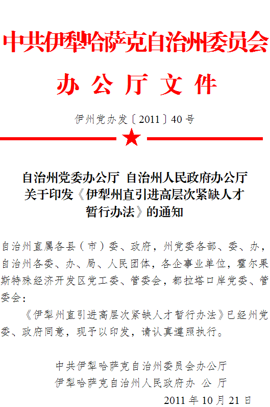 自治州党委办公厅 自治州人民政府办公厅关于印发《伊犁州直引进高层次紧缺人才暂行办法》的通知