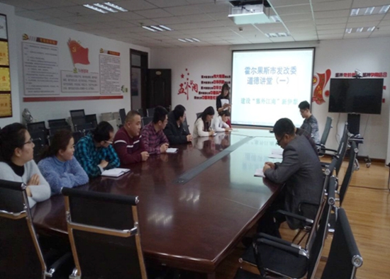 创新形式,开展“道德讲堂”活动。以“道德讲堂”为载体,紧扣州党委工作会议精神的主题,发改干部一起诵读经典,畅谈感想,积极为霍尔果斯市的未来发展送祝福,营造勤学务实、敬业负责、积极向上的浓厚氛围,努力改善工作作风,提升工作效率,做好服务群众工作,促进发改工作再上新台阶。(霍尔果斯市发改委 王霞供稿)