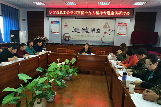 研讨会开始前,县总工会副主席发表讲话,她表示:“学习宣传贯彻十九大精神,是当前和今后一个时期的首要政治任务,全县各级工会组织要给予高度重视,同时要结合学习贯彻自治区党委九届四次全体会议、伊犁州党委工作会议精神,工会工作实际,把会议精神,特别是十九大精神落实到具体实际工作当中,带领好广大职工为‘美好杏花乡’再立新功。”