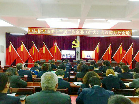 10时30分,伊宁市委十三届三次全委扩大会议会议正式开幕,参会的代表们精神昂扬,全体高唱国歌。州党委常委、市委书记李新军作题为《贯彻新思想、聚焦总目标、担当新使命,在打造“塞外江南”新伊犁的宏伟进程中勇立潮头》的报告。这次会议的主题是以习近平新时代中国特色社会主义思想为指导,深入贯彻党的十九大精神、党中央治疆方略、自治区党委九届四次全体会议和自治州党委工作会议精神,贯彻落实中央和自治区党委经济工作会议精神,深度聚焦社会稳定和长治久安总目标,不忘初心、忠诚担当,牢记使命、不懈奋斗,努力建设平安、畅通、美丽、智慧、健康、幸福城市,在打造“塞外江南”新伊犁的宏伟进程中勇立潮头、始终走在全州前列。